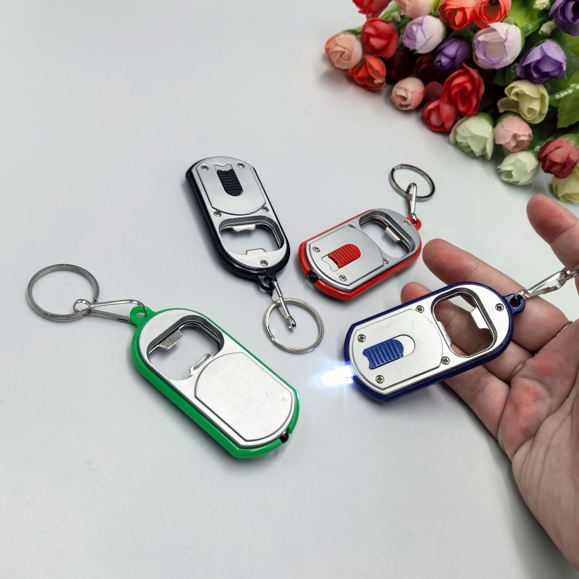 LASER & LED LIGHT WITH CARABINER Material: Aluminum alloy Unit Size: 8*1.5cm Battery: 3pcs LR44 included Packing: each piece in a polybag Meas/ctn: 40*30*30cm/500pcs GW/NW: 10/9kgs